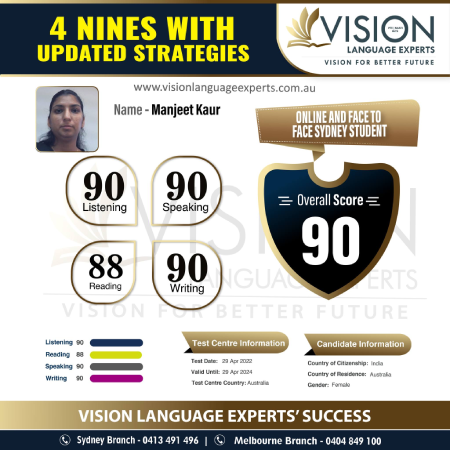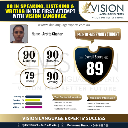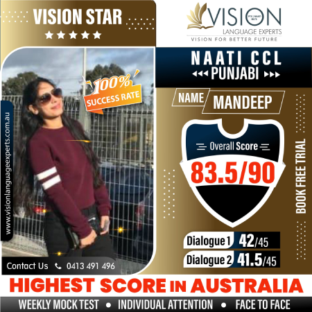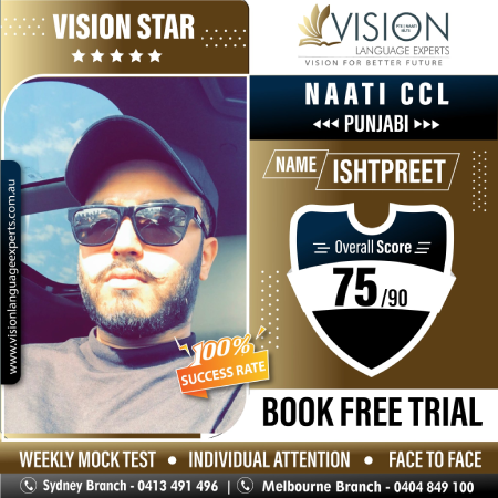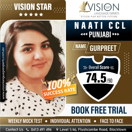 " Thank you so much Vishal Sir and Vipasha Mam for your guidance with the help of which I passed my Naati CCL Punjabi exam with great scores. I would highly recommend Vision Language Experts to all the students who want to get their desired score in PTE and Naati. ".