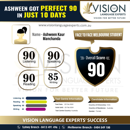 " Finally got my desired score! I highly recommend Vision Language Experts for the aspirants of PTE and NAATI. I got my desired score within a month. The entire team is very helpful. They provide the best strategies and one-to-one learning environment. A special thanks to Vishal sir and Vipasha mam for your continuous feedback and guidance. ".